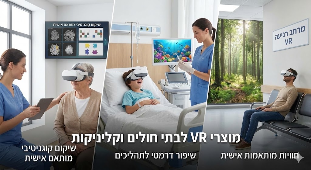 מוצרי המציאות המדומה שלנו עבור בתי חולים וקליניקות מעניקים את הפתרון הטוב ביותר בתחום הHealthcare והטיפול הקוגניטיבי. המוצרים בעלי ערך מוסף רב, עם התאמה אישית ושיפור דרמטי לתהליכים פרה-רפואיים ורפואיים כאחד.