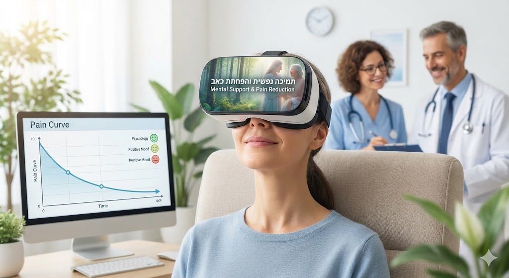במהלך השהות בתוך סימולציה במציאות מדומה, נוצר תהליך מדהים – במסגרתו הצופה מפוקס לחלוטין בתוכן וכך ניכר שיפור ברף הכאב. יתרה מזו -באמצעות חוויות ייחודיות הוכחנו כי מצב הרוח משתפר פלאים ותהליכים רפואיים מבוצעים על הצד הטוב ביותר.